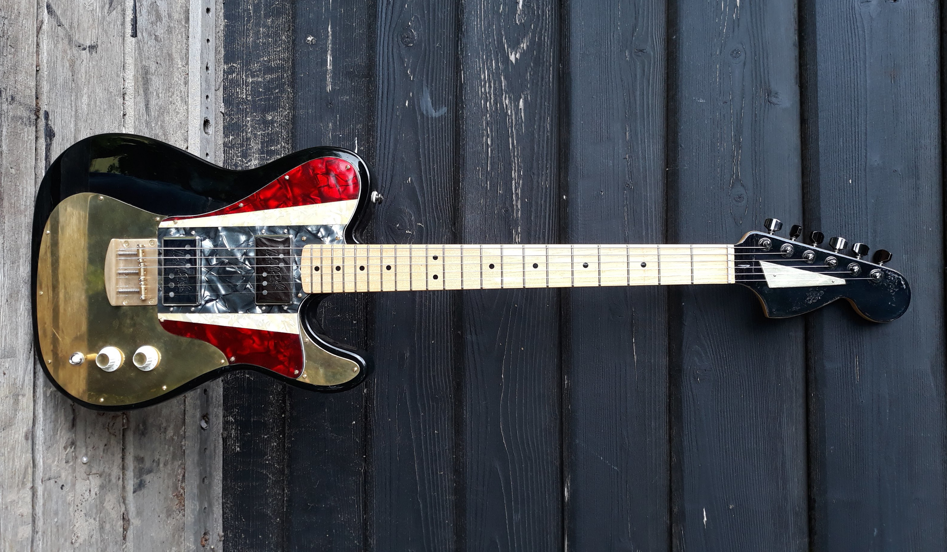 Featuring hand-carved polished brass panels and custom-veneered vintage celluloid pickguards,