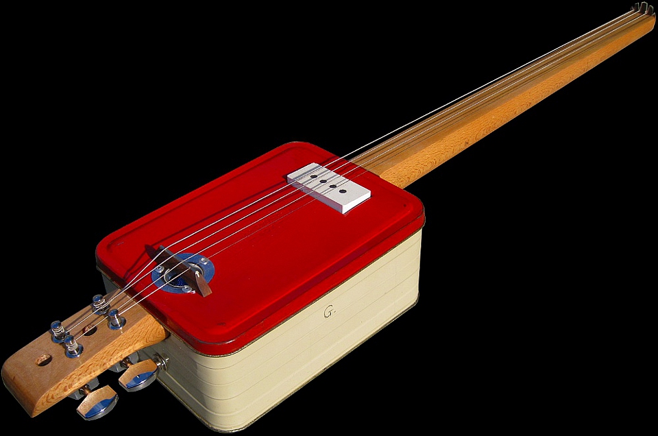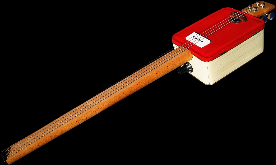 c1940s Two-Tone Red/Cream "SANDWICH BOX" Tin Body, Adapted c.1940s Beech Table-Leg Neck