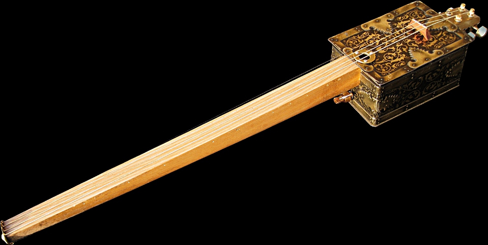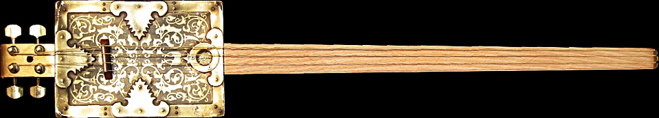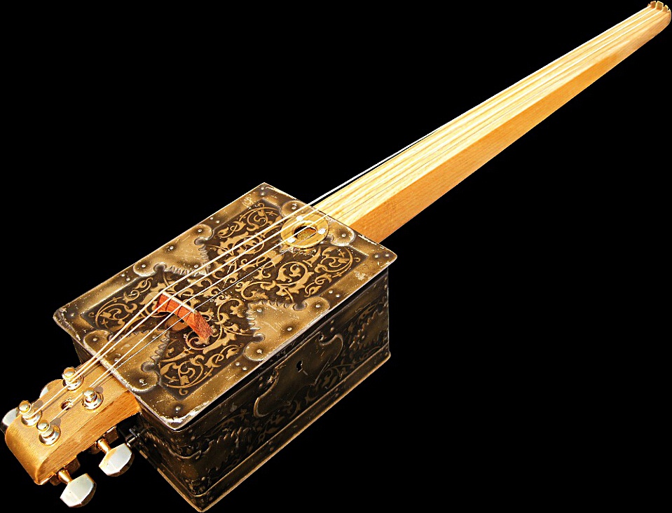 c.1920s GEO. BASSETT'S Embossed Casket Tin Body, c.1940s Beech Table Leg Neck, Gold Headstock