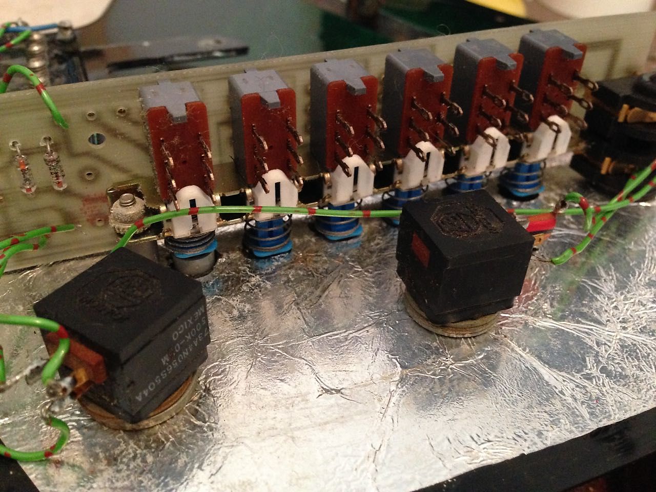 The square chassis control pots were A-B (Allen & Bradley) Mod Pots, made in Mexico and 500K in value. They were probably obtained from the same source that supplied components for the MM mixers built by Burns' parent company PA:CE Electronics. Quality was supposed to be high, but I found that they soon suffered from scratchy sounding operation due to static build-up, so not a good choice.