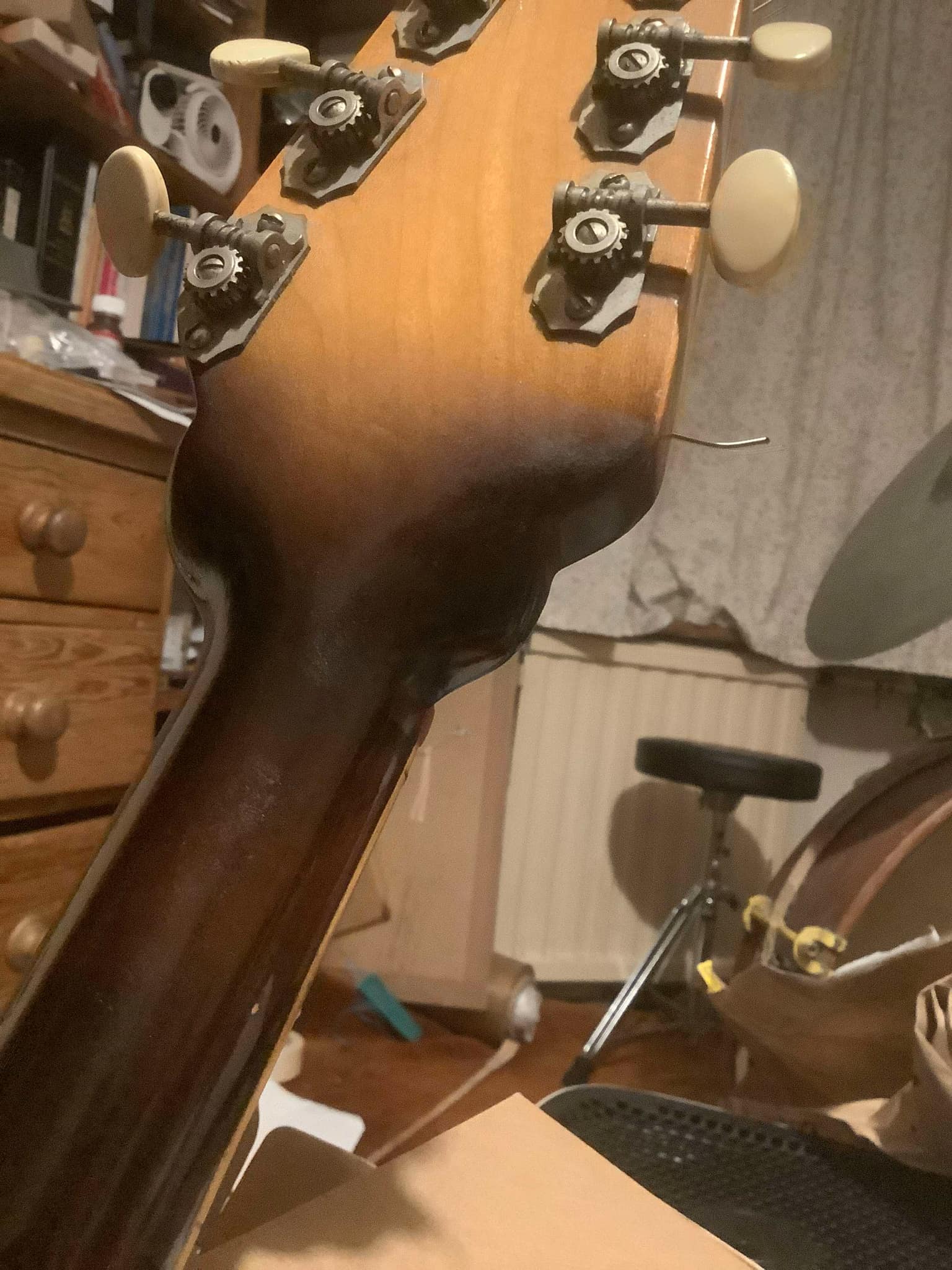 After renovation, with different knobs, tuners, lost 2nd guard.
