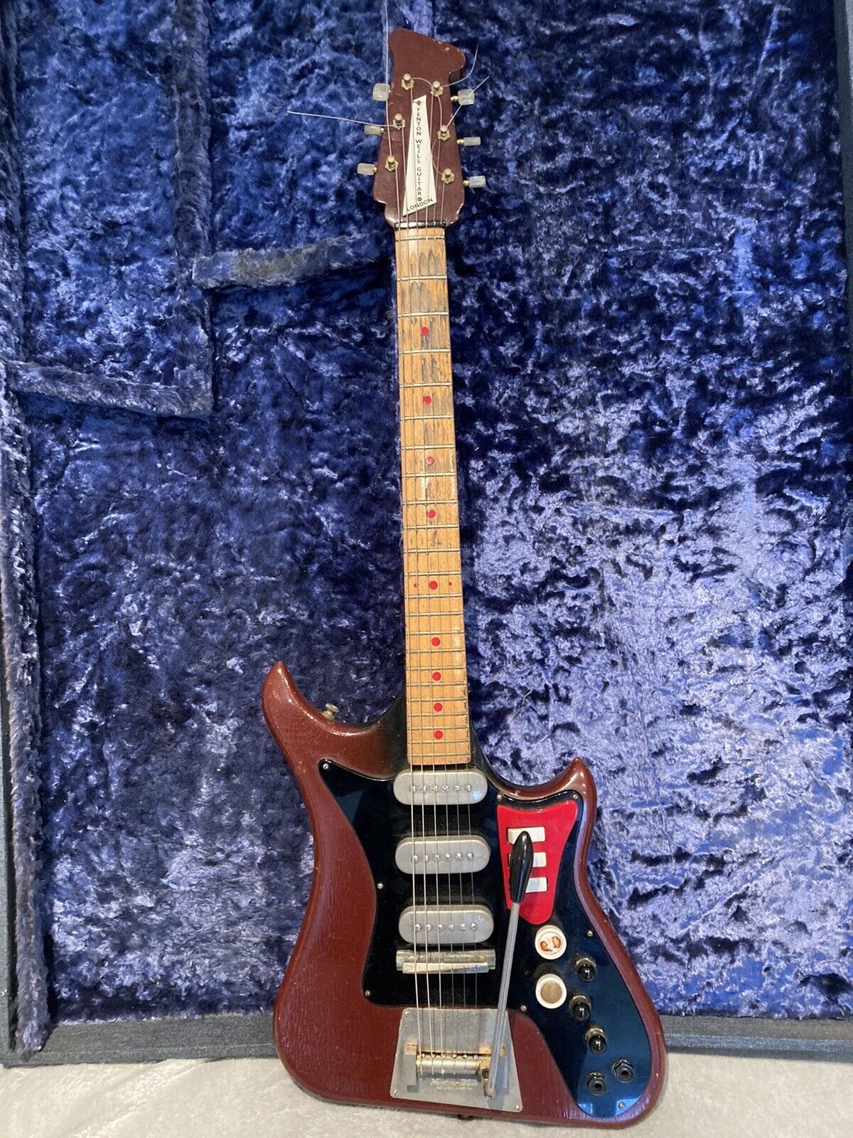 The AMERICAN LABEL RANGE was announced with this advert in November 1961 and was comprised of the existing Twinmaster (pka Streamline Super) / Triplemaster / Stereomaster / Contrabass models. These were: a medium scale 2-pickup guitar, a short-scale 3-pickup mono, or stereo guitar, and accompanying bass version of the Super Streamline model. Updated to 6-in-line headstock for the Christmas 1961 advert. Also offered with Twister body shape from June 1962-1963/4. Contrabass continues to be offered through 1963/4, alongside the Twistratone Bass (from 1962 with Penetrone pickups).
