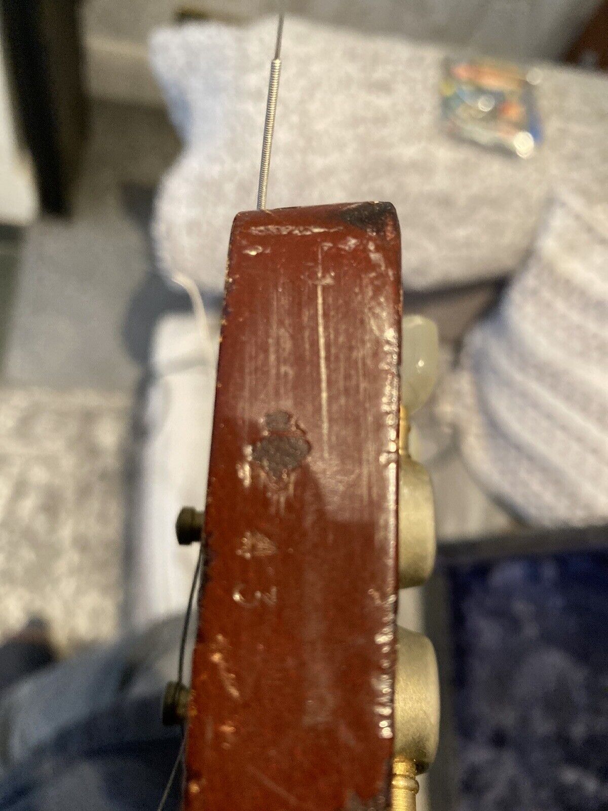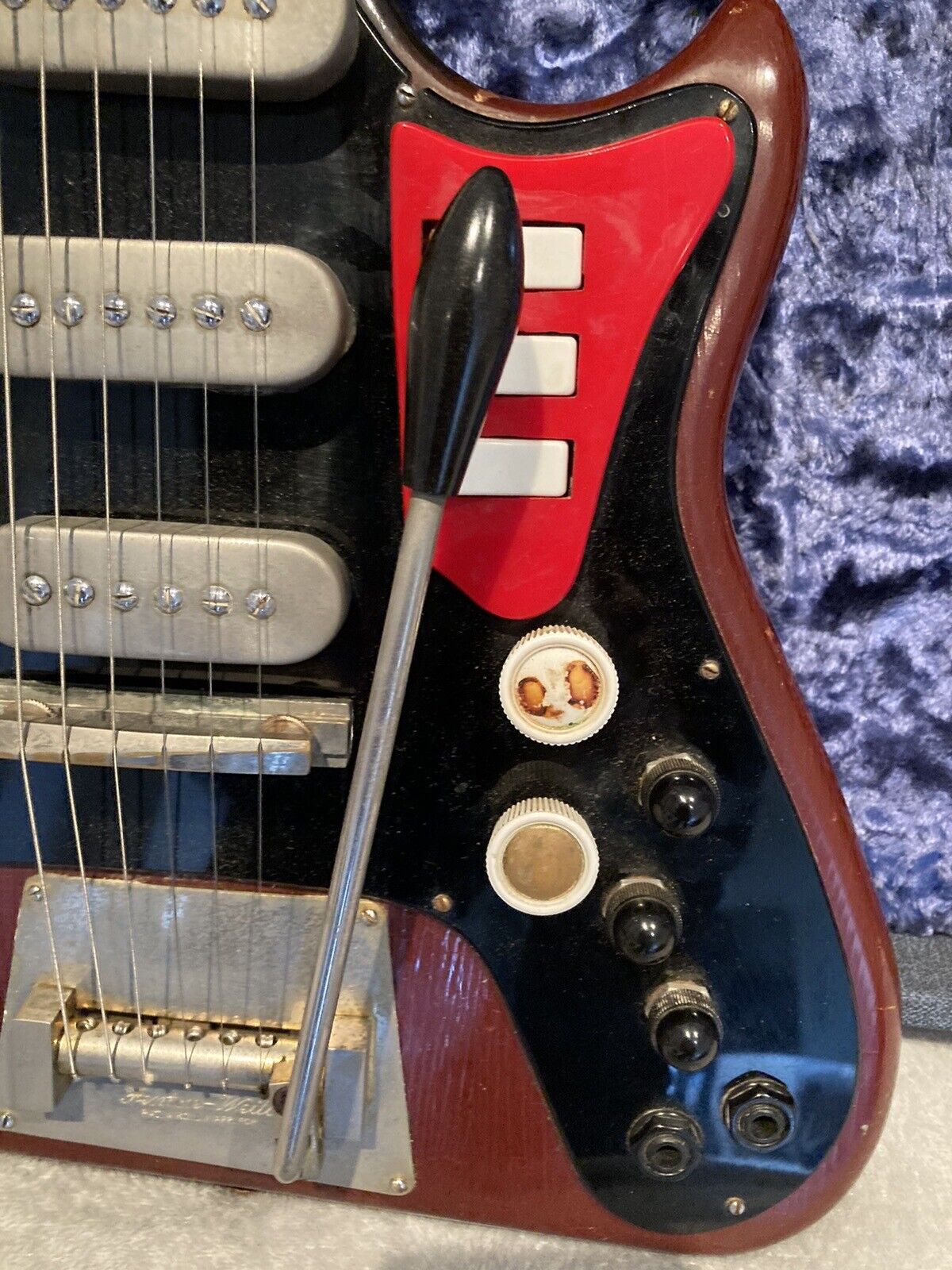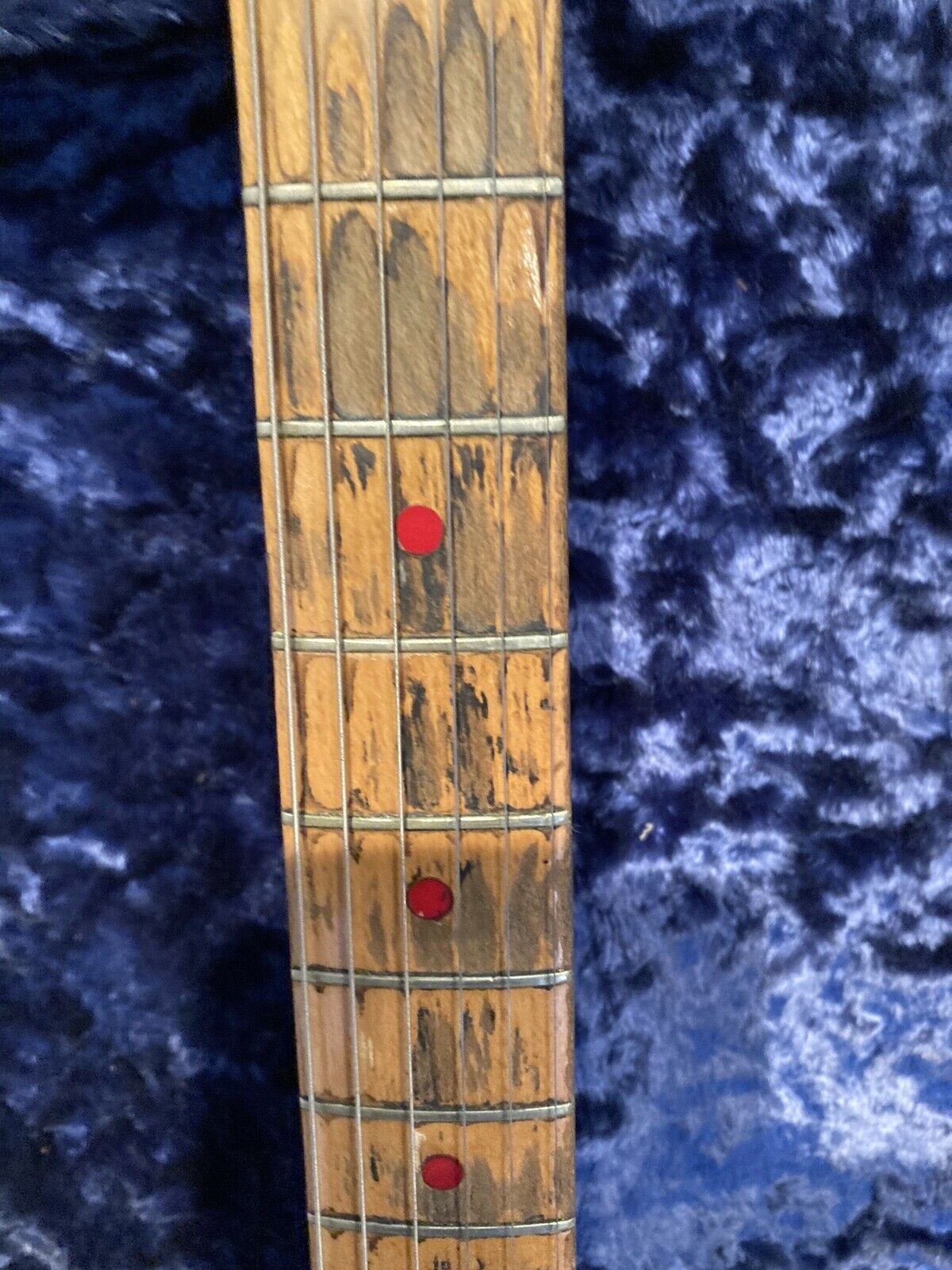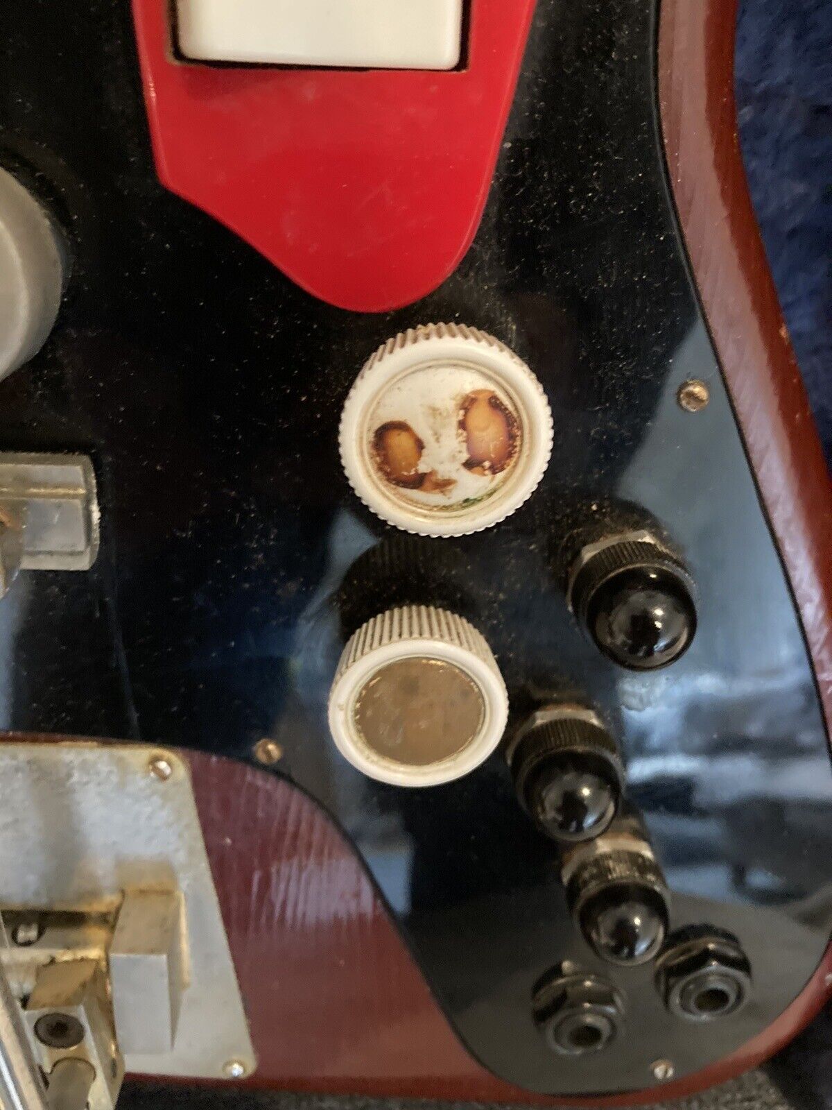 This guitar's owner states that this guitar originally had a Gold-plated vibrato and pickups, which were removed and lost.