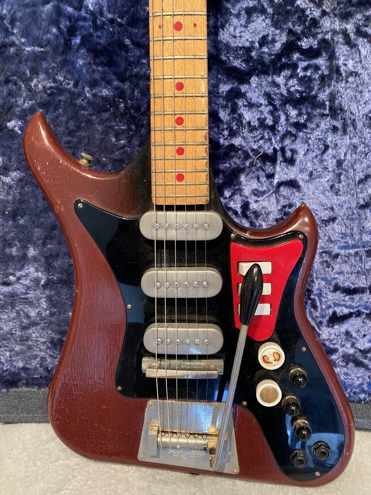 3-a-side headstock, symmmetrical vibrato surroundplate, jack socket experimentally(?) moved to face of instrument