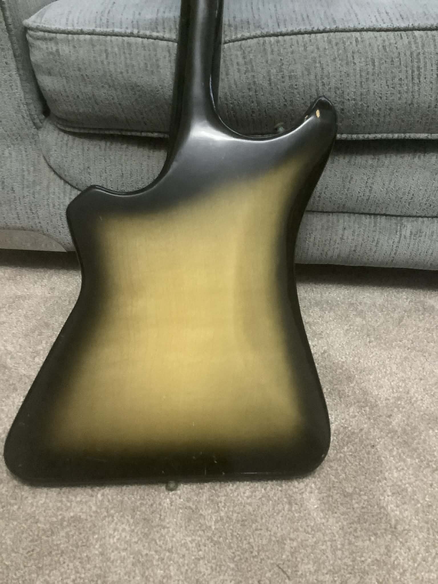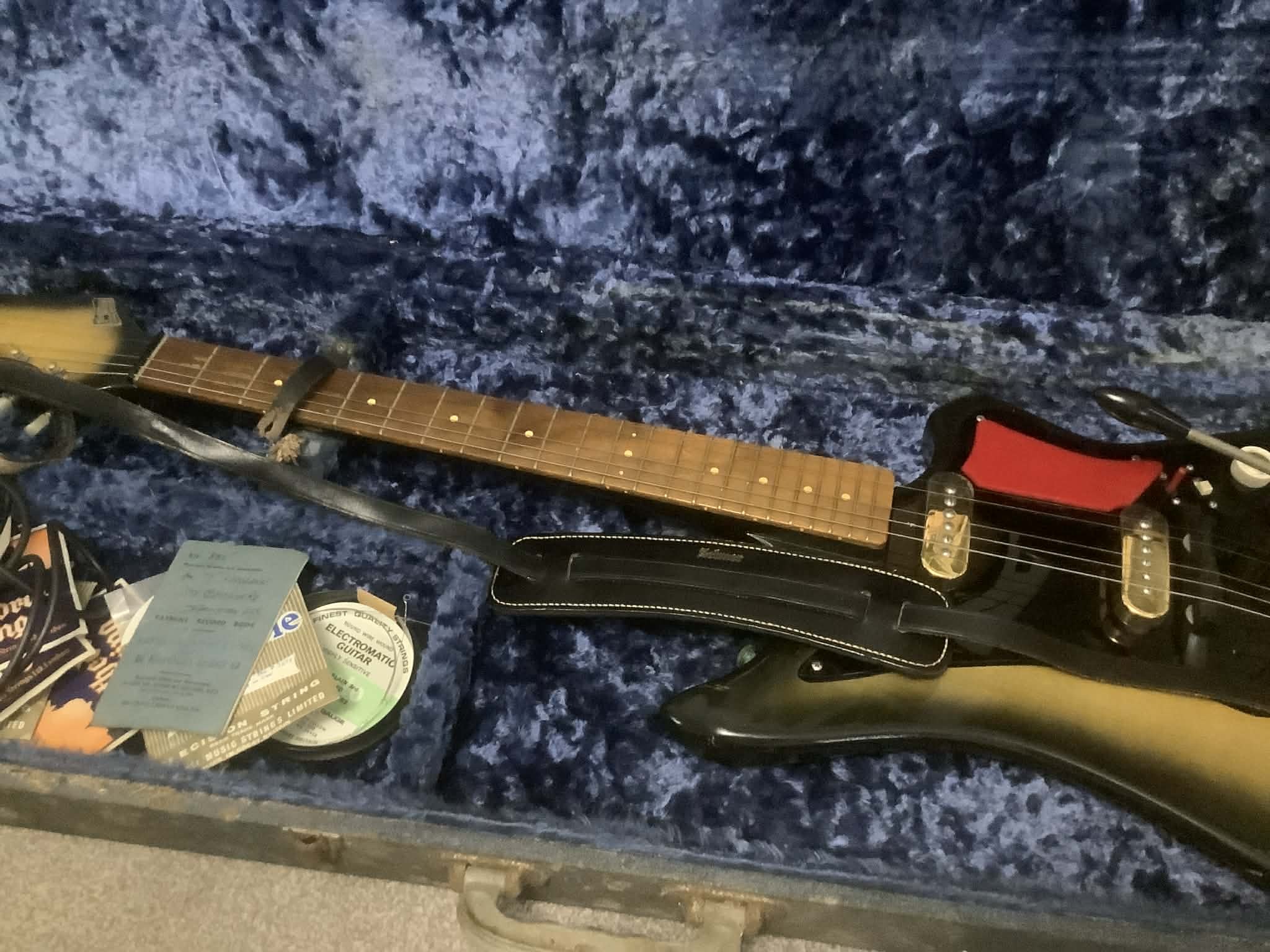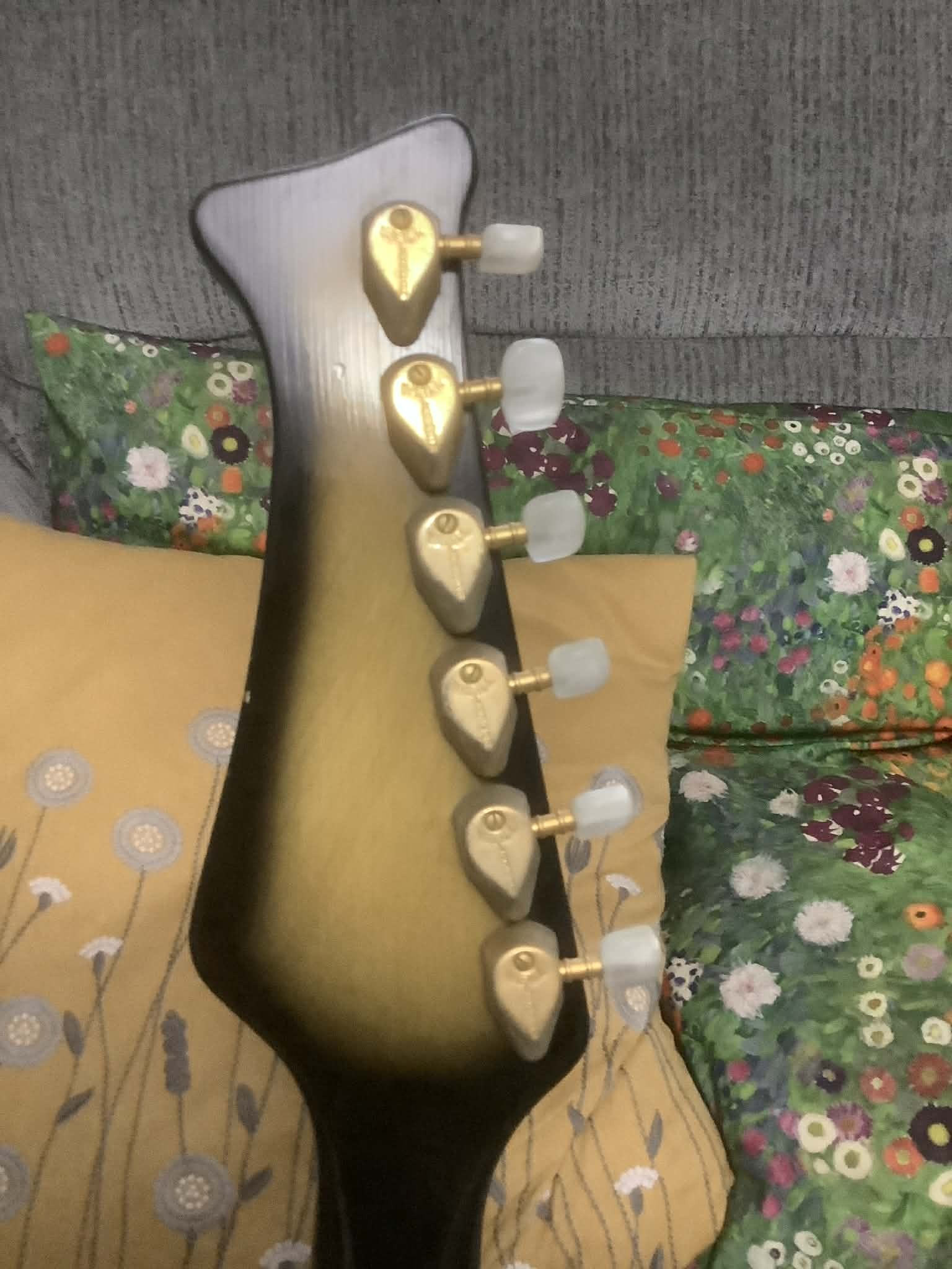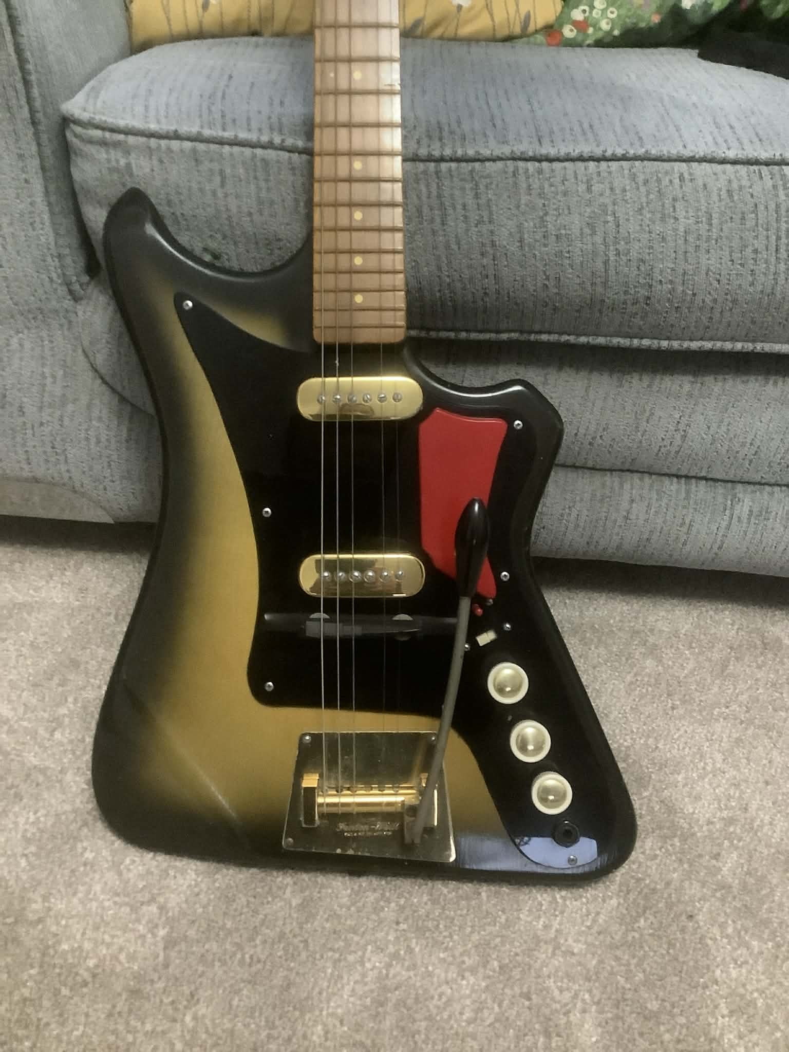 This guitar's owner states that this guitar originally had a Gold-plated vibrato and pickups, which were removed and lost.