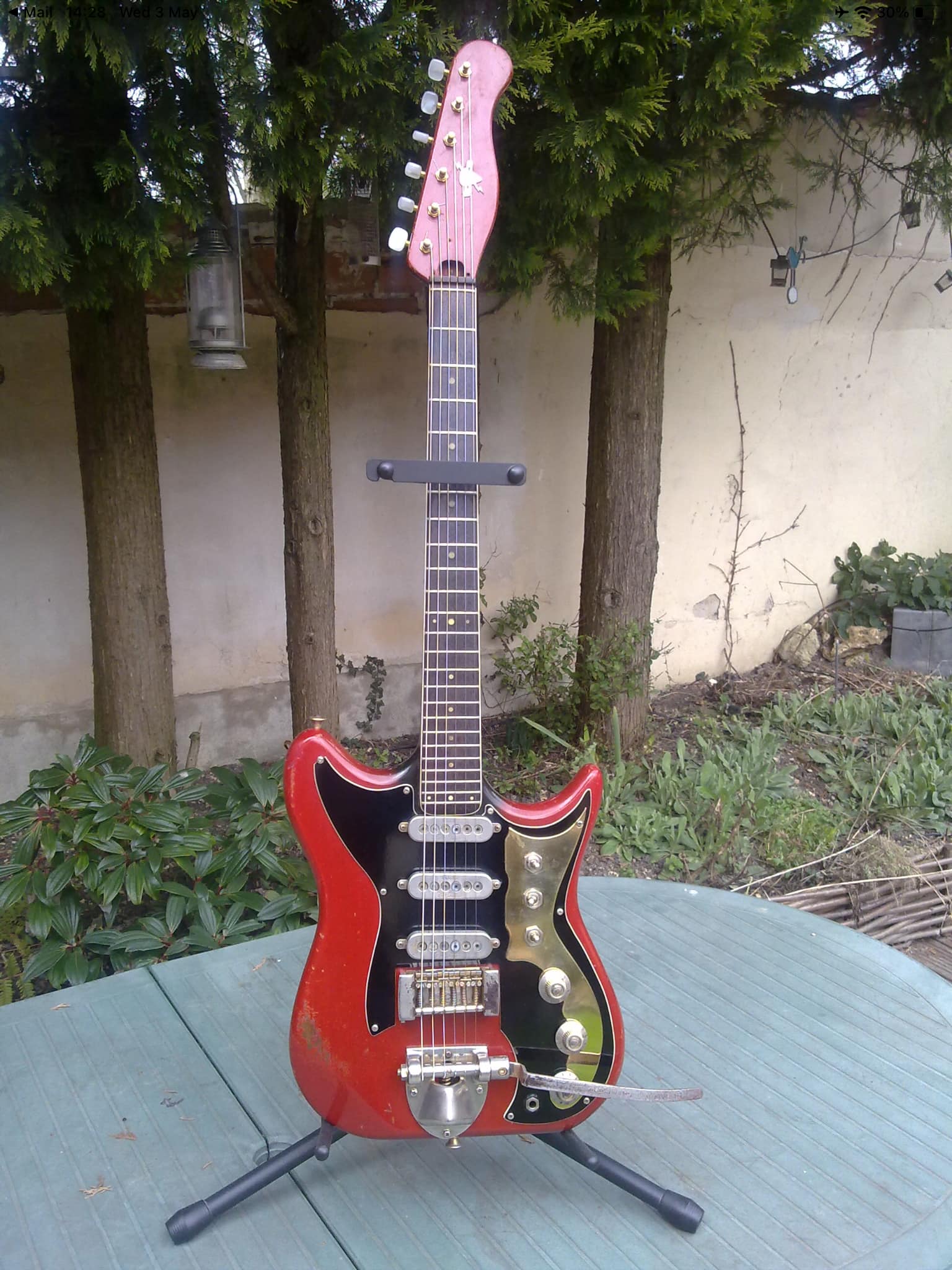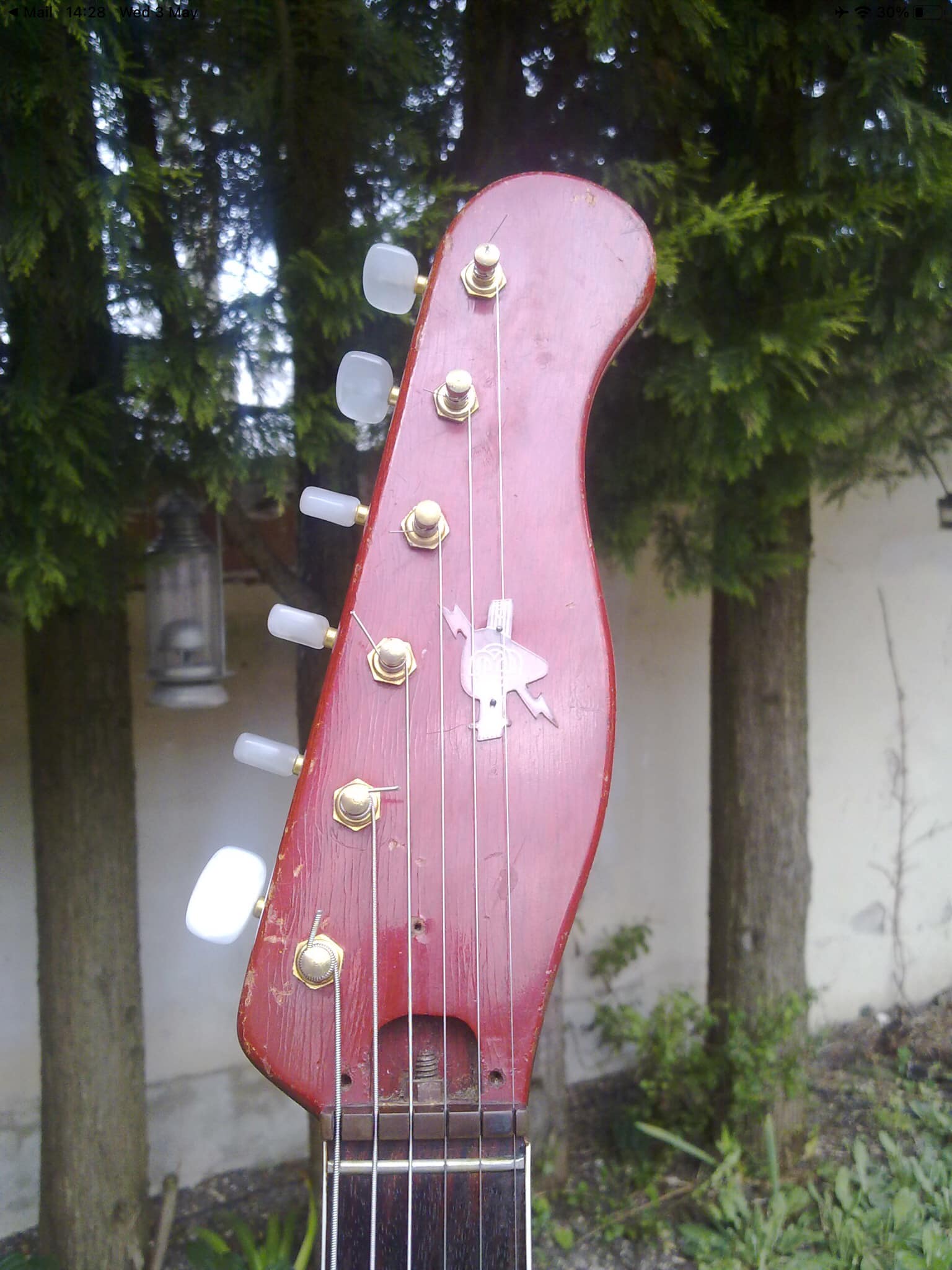 Same guitar before restoration/refinishing, with the wrong knobs and no secondary plate.