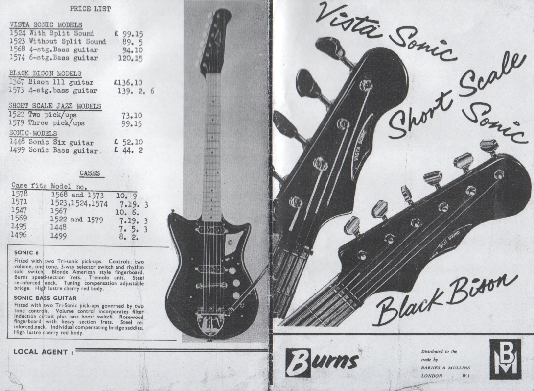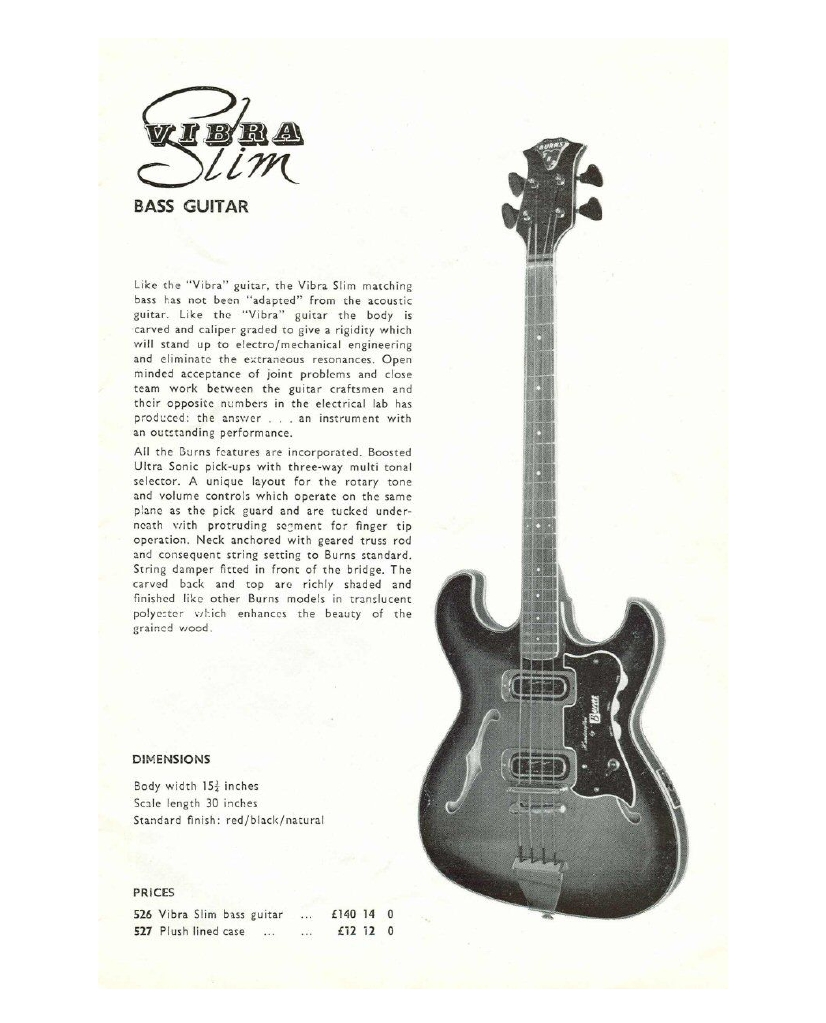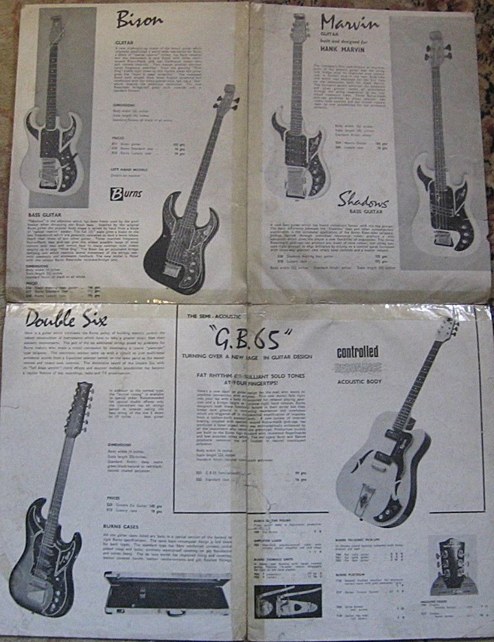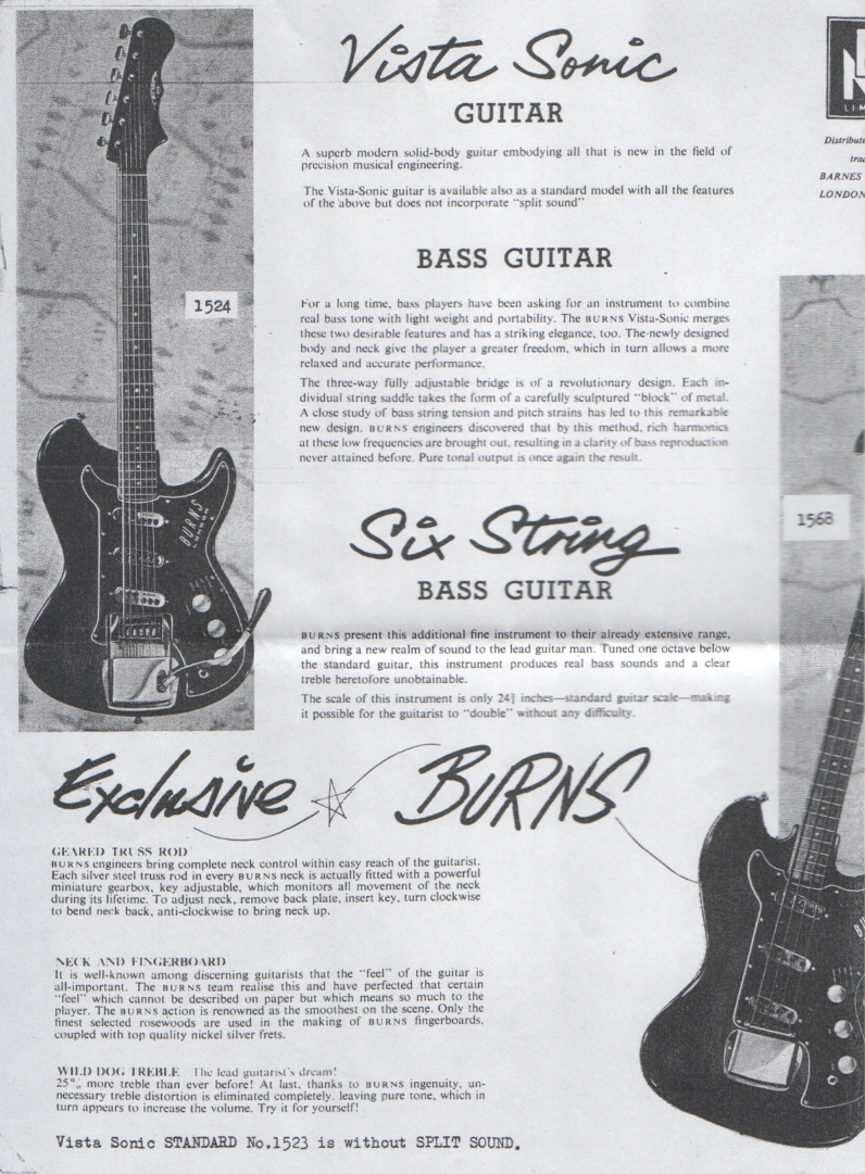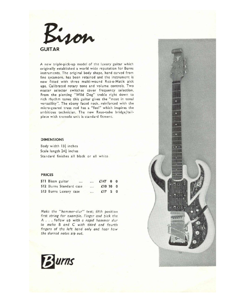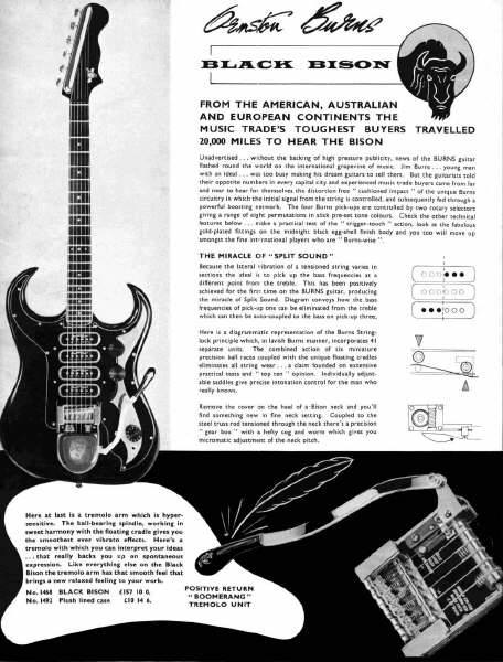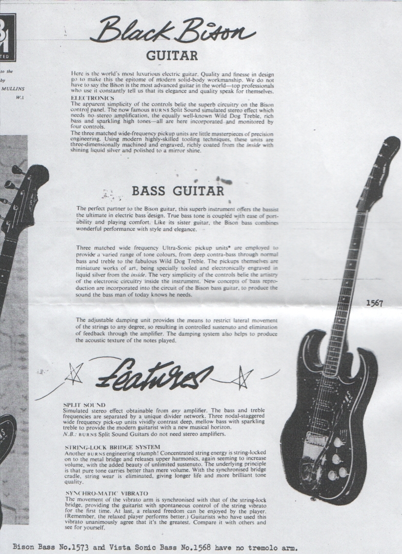 " This is a repro of an actual two-sided, single page leaflet dated April 1962, which also includes the Vibra Artist Deluxe and other models. I used to also own an earlier different edition (unfortunately long gone and I’ve never seen another) showing the Bison backed by a black-finished, three-pickup thinline semi, the latter being the first in a series of prototype designs that culminated with the TR2 and Vibraslim. The earlier brochure was exactly the same as the second in terms of the Bison page, just the reverse side was different. The black thinline pictured had the same styling as subsequent prototype variations, i.e. as used on the TR2 and Vibraslim, whereas the thinline semi shown in the various MM ads for the Burns vibrato was that sunburst finish, twin-cutaway three-pickup example handbuilt by Jim. Note that the first ad was in the June 10 1961 issue and this new vibrato was called just the Master; the July 8 advert then added the Mk.VII suffix, while the Oct 28 ad called it the Master Mk.III, available at a reduced price. Finally, the Burns ad in the Dec 2 1961 issue was the first to mention the “new” Mk.9 version. There you are, a potted but date accurate history of Burns vibrato unit development, all thanks to those wonderful old Melody Makers!" - Paul Day