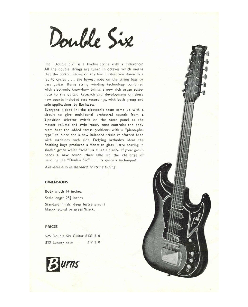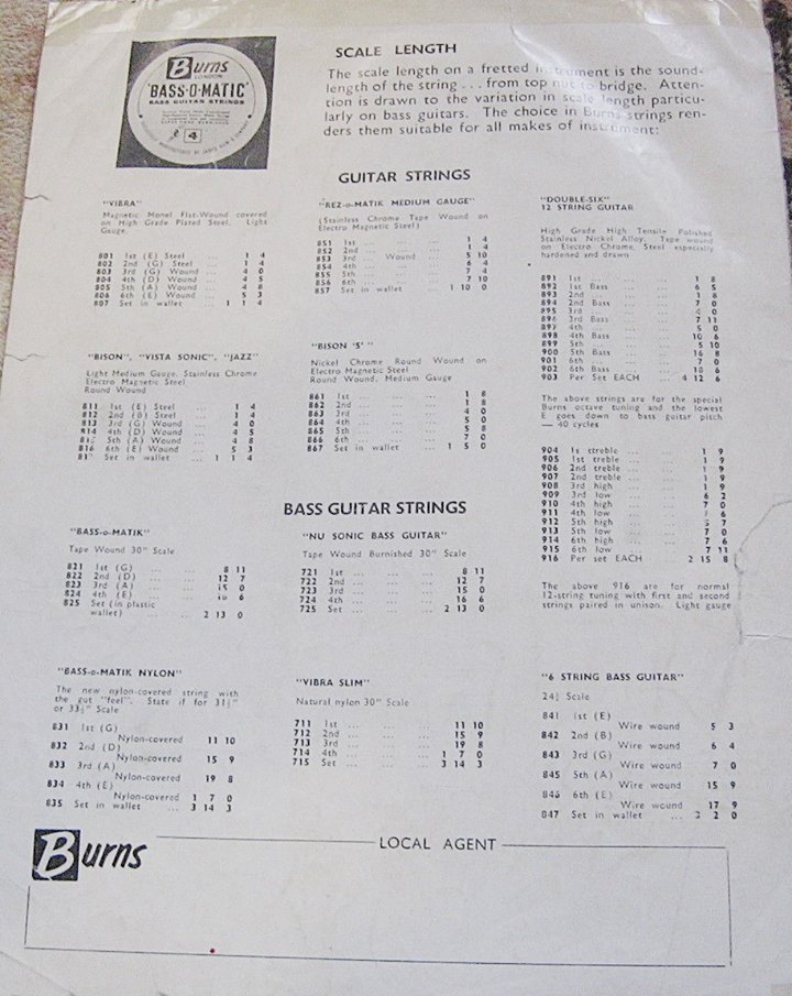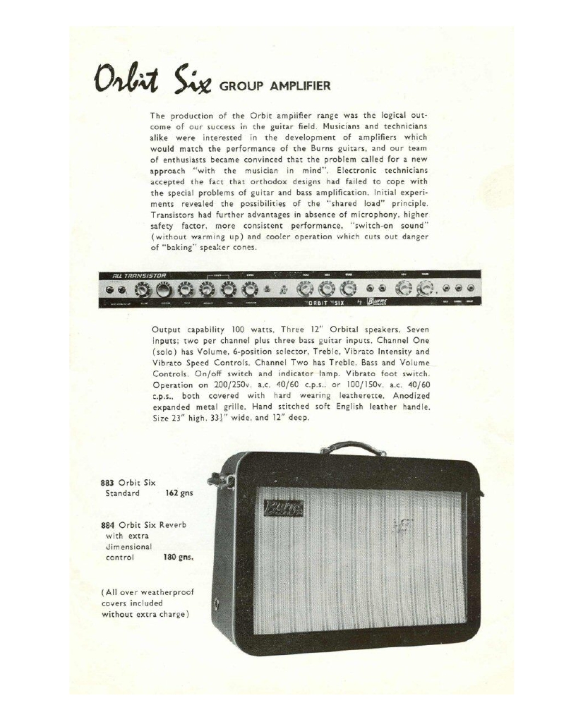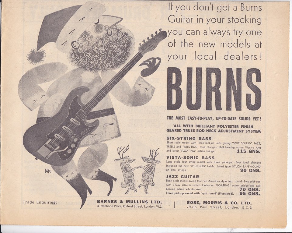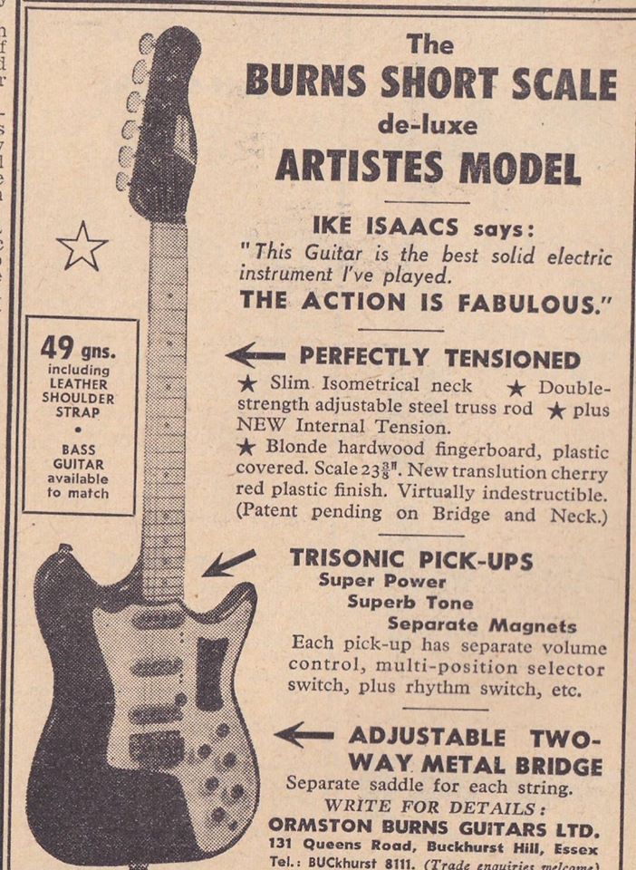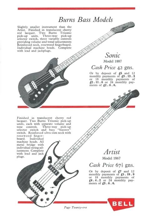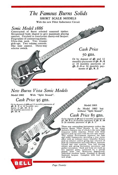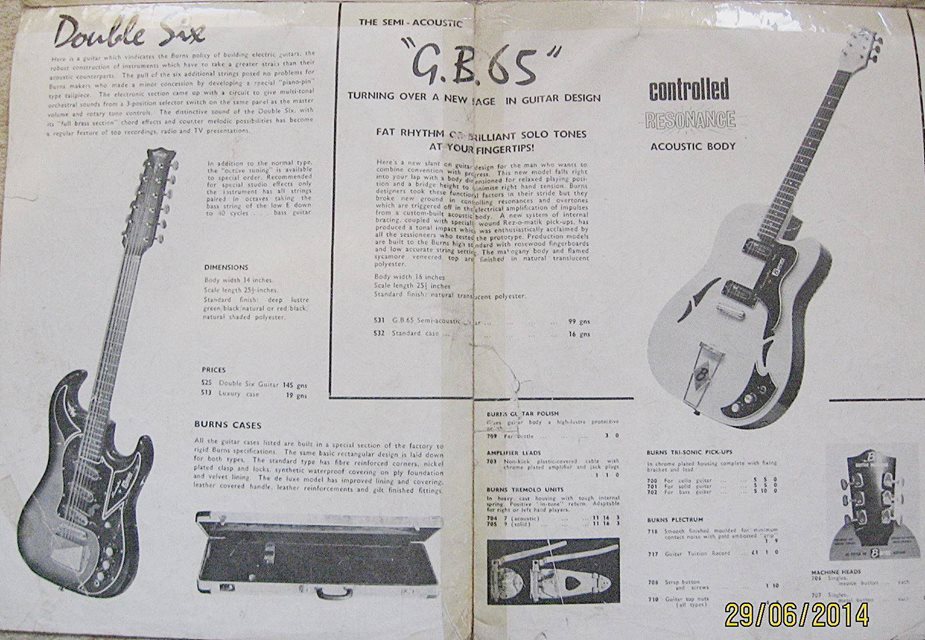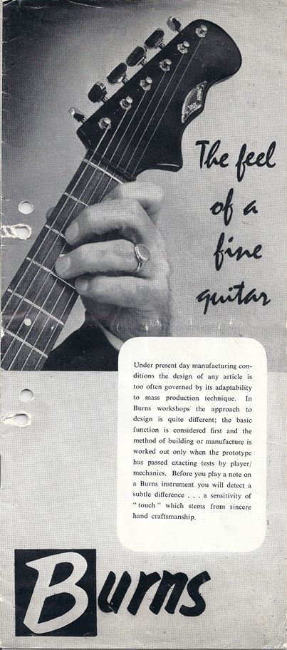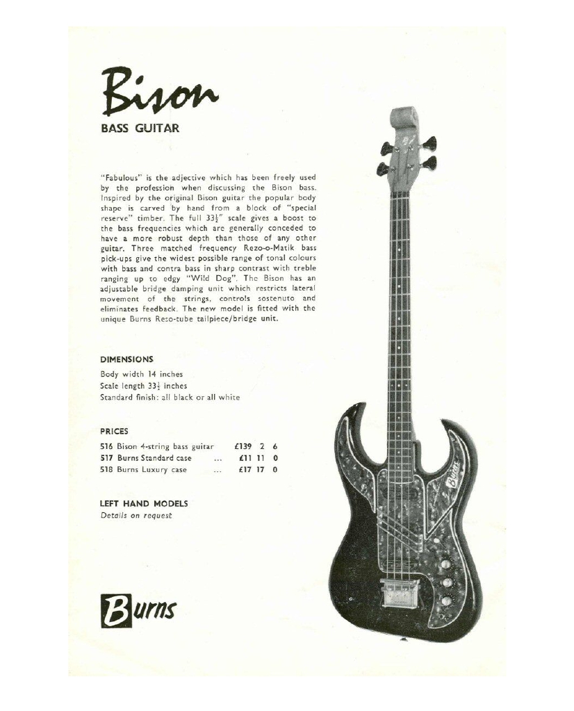 " This is a repro of an actual two-sided, single page leaflet dated April 1962, which also includes the Vibra Artist Deluxe and other models. I used to also own an earlier different edition (unfortunately long gone and I’ve never seen another) showing the Bison backed by a black-finished, three-pickup thinline semi, the latter being the first in a series of prototype designs that culminated with the TR2 and Vibraslim. The earlier brochure was exactly the same as the second in terms of the Bison page, just the reverse side was different. The black thinline pictured had the same styling as subsequent prototype variations, i.e. as used on the TR2 and Vibraslim, whereas the thinline semi shown in the various MM ads for the Burns vibrato was that sunburst finish, twin-cutaway three-pickup example handbuilt by Jim. Note that the first ad was in the June 10 1961 issue and this new vibrato was called just the Master; the July 8 advert then added the Mk.VII suffix, while the Oct 28 ad called it the Master Mk.III, available at a reduced price. Finally, the Burns ad in the Dec 2 1961 issue was the first to mention the “new” Mk.9 version. There you are, a potted but date accurate history of Burns vibrato unit development, all thanks to those wonderful old Melody Makers!" - Paul Day