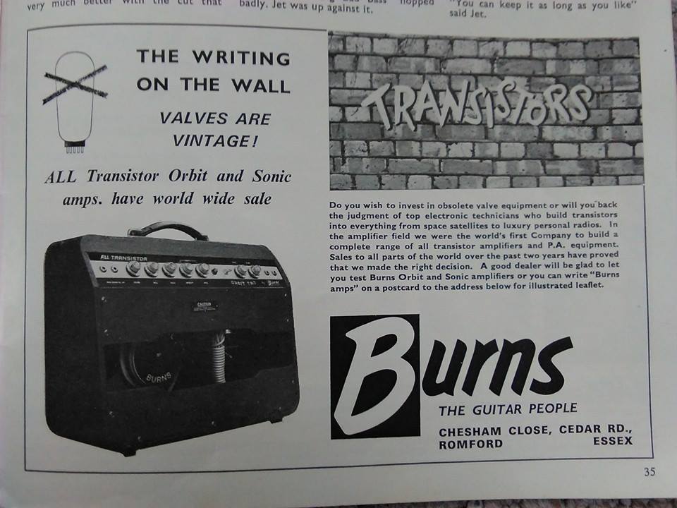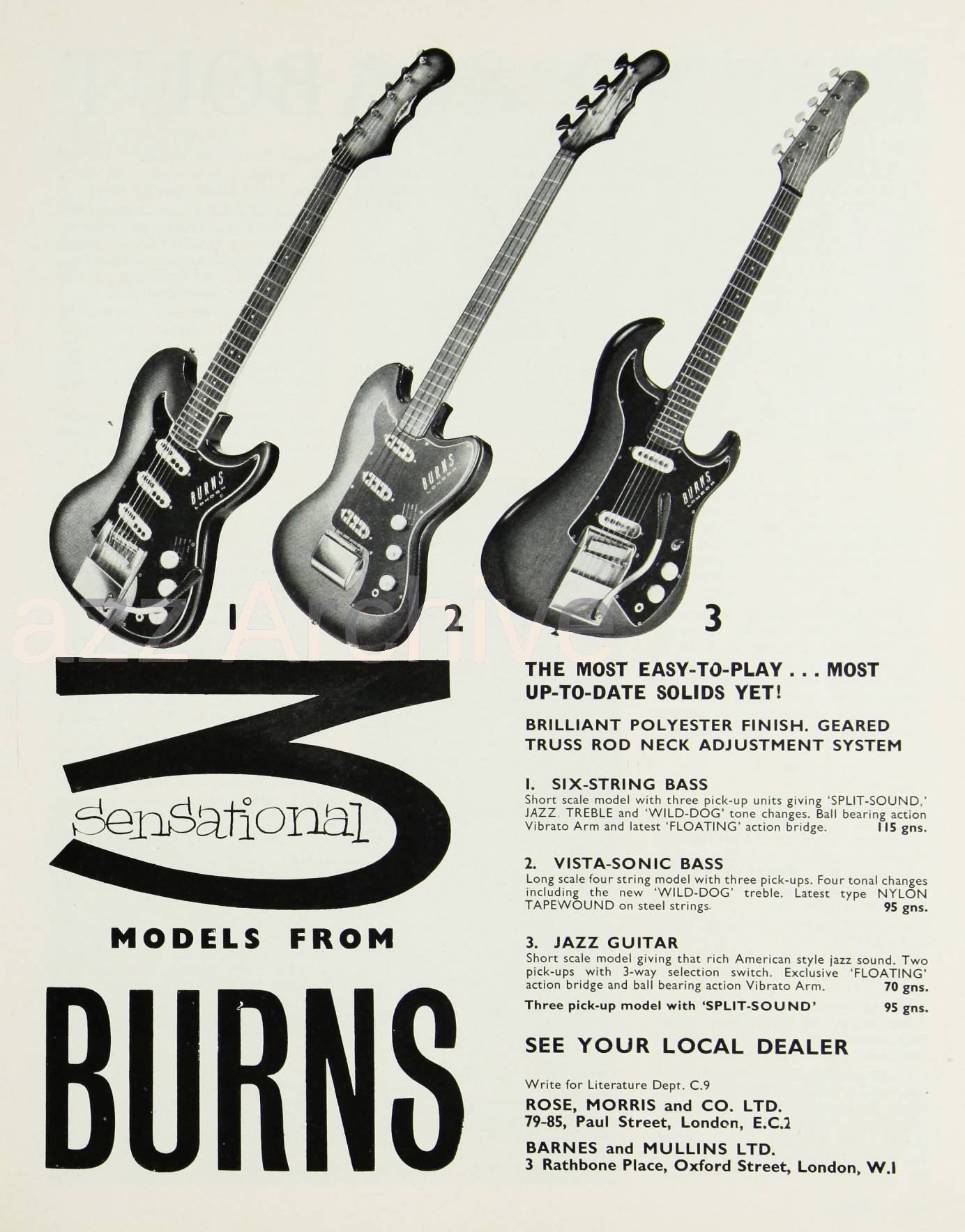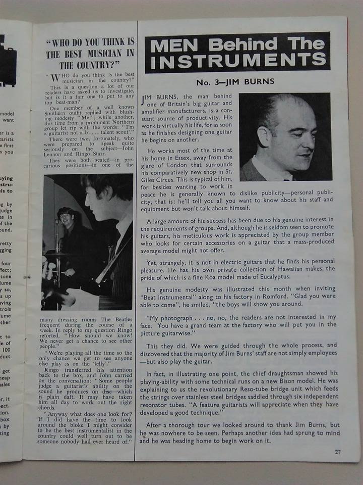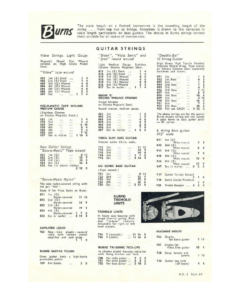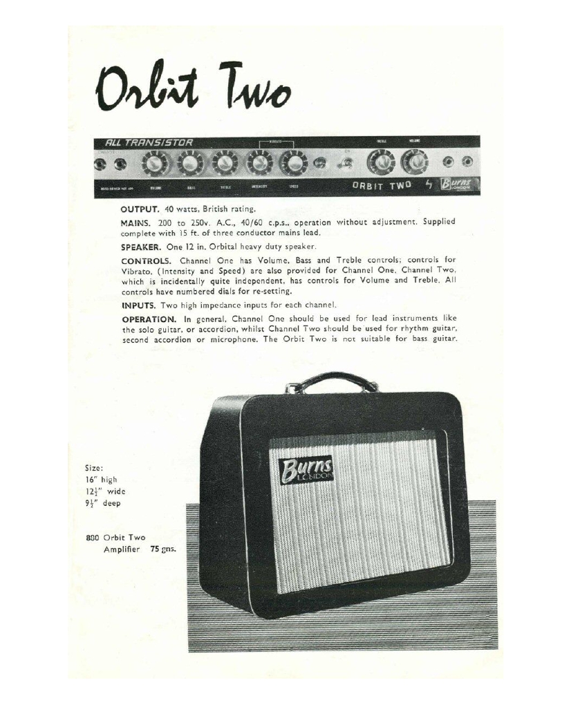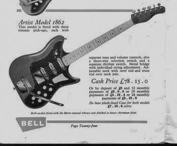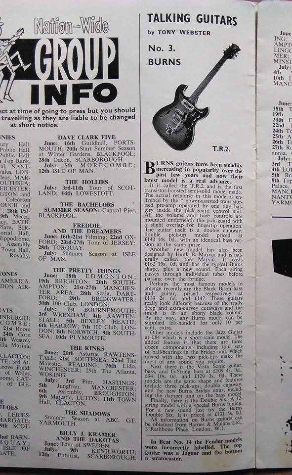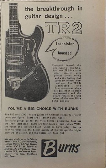 " This is a repro of an actual two-sided, single page leaflet dated April 1962, which also includes the Vibra Artist Deluxe and other models. I used to also own an earlier different edition (unfortunately long gone and I’ve never seen another) showing the Bison backed by a black-finished, three-pickup thinline semi, the latter being the first in a series of prototype designs that culminated with the TR2 and Vibraslim. The earlier brochure was exactly the same as the second in terms of the Bison page, just the reverse side was different. The black thinline pictured had the same styling as subsequent prototype variations, i.e. as used on the TR2 and Vibraslim, whereas the thinline semi shown in the various MM ads for the Burns vibrato was that sunburst finish, twin-cutaway three-pickup example handbuilt by Jim. Note that the first ad was in the June 10 1961 issue and this new vibrato was called just the Master; the July 8 advert then added the Mk.VII suffix, while the Oct 28 ad called it the Master Mk.III, available at a reduced price. Finally, the Burns ad in the Dec 2 1961 issue was the first to mention the “new” Mk.9 version. There you are, a potted but date accurate history of Burns vibrato unit development, all thanks to those wonderful old Melody Makers!" - Paul Day